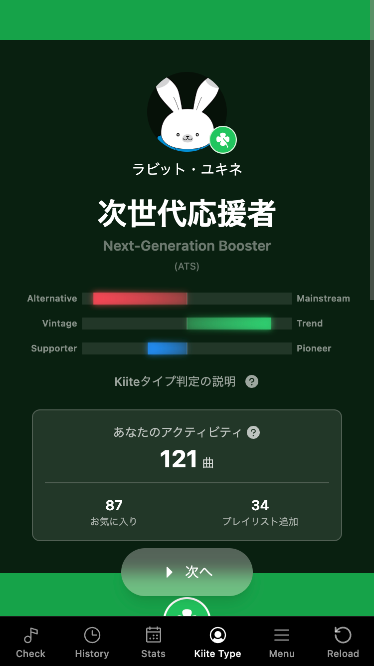 Kiite でのお気に入りやプレイリスト追加のアクティビティをもとに、あなたのKiite タイプの判定結果が表示されます。